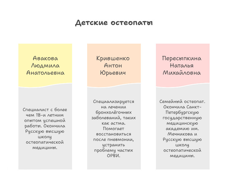 ✔ Крившенко Антон Юрьевич. Окончил Медицинскую академию им. И.И. Мечникова и Институт остеопатической медицины им. В.Л. Андрианова. Имеет звание «Доктора Остеопатии». Специализируется на лечении бронхолёгочных заболеваний, таких как астма. Помогает восстановиться после пневмонии, устранить проблему частых ОРВИ.